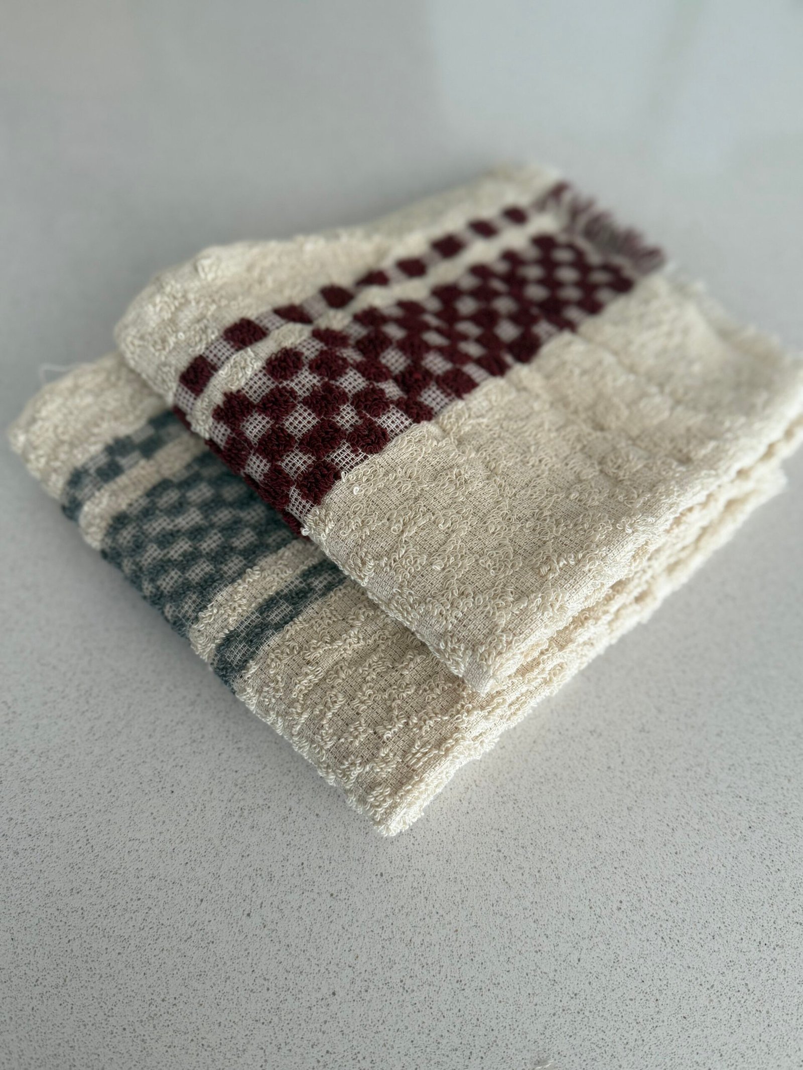 Nuestros repasadores de cocina están confeccionados en 100% algodón tejido artesanal, con un diseño a rayas y cuadros.